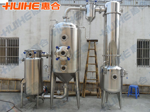 The single effect outer cycle vacuum concentrator is composed of heater, evaporator, defoamer, condenser, cooler and liquid receiving tank. The parts that contact materials are all made of stainless steel. The equipment is applicable to evaporation and concentration of liquid materials in pharmacy, food, chemical industry, light industry and etc. The concentrating time is short and the evaporating speed is high, which can better protect the heat sensitive materials from being damaged.